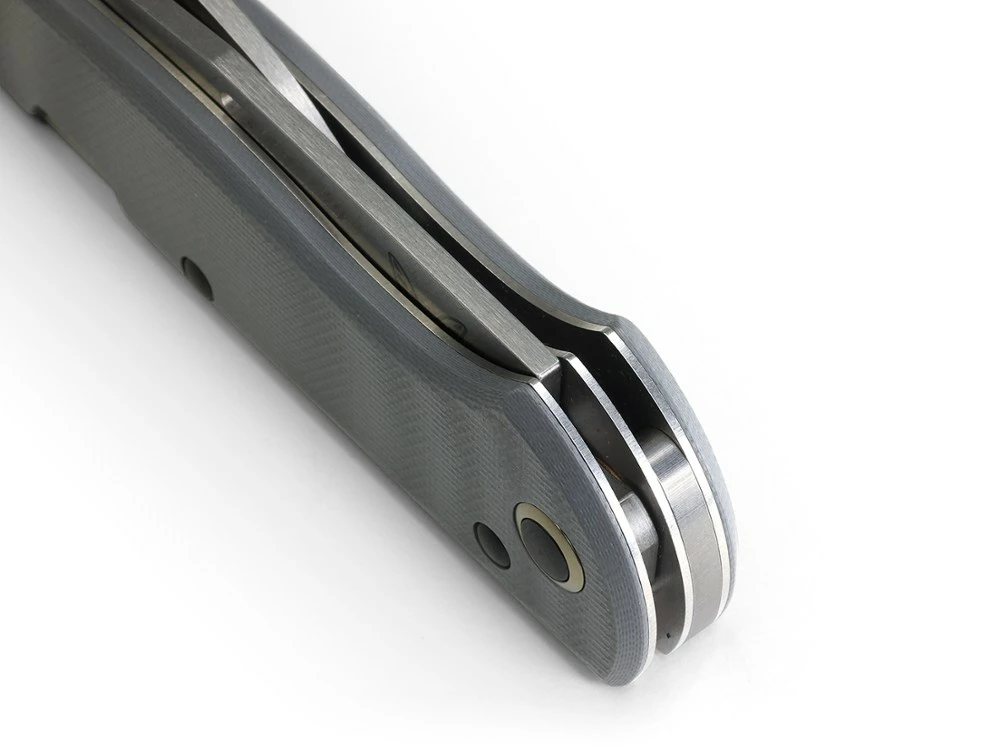 - Cool gray G10 handles and OD aluminum decorative pivot rings give this knife a clean look