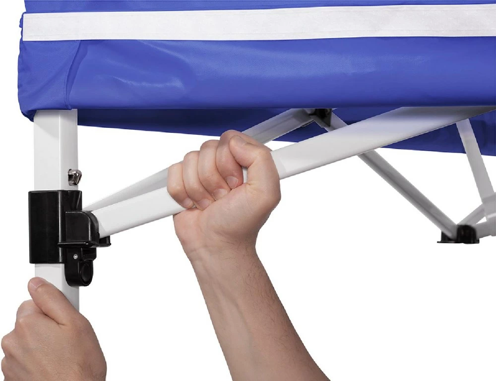 - Legs feature push-release buttons so you can quickly adjust to 10.3-, 10.7- or 11-ft. peak height