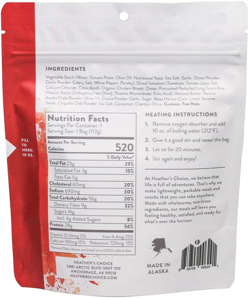 Nourish yourself quickly after a hard hike with Heather’s Choice Chicken Mole and Rice, a savory traditional Mexican sauce of spicy goodness smothering chicken over rice. Just add boiling water.