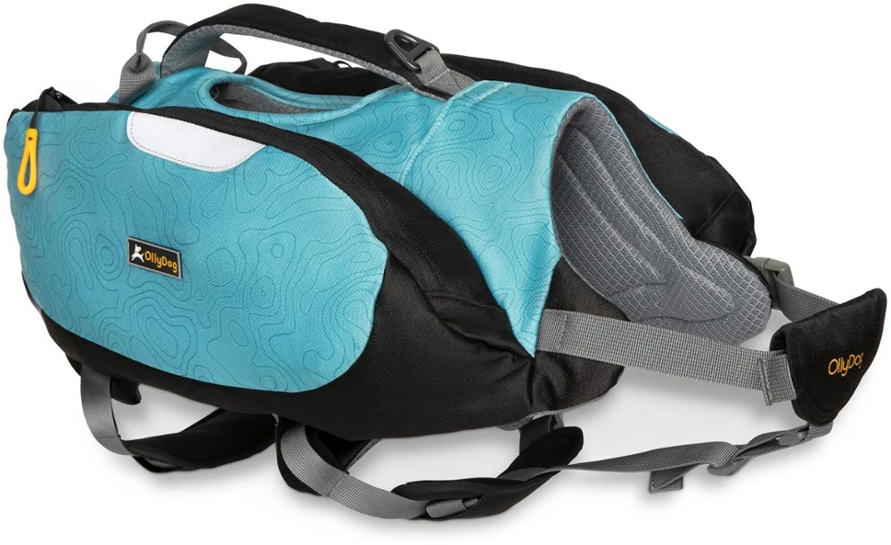 - Water-resistant dog pack is made with lightweight materials and a sleek design with padded straps to avoid chafing