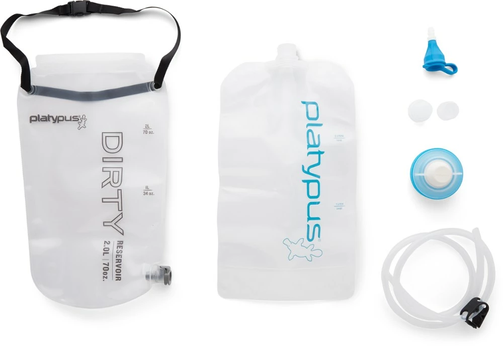 - Complete kit includes a 2-liter dirty collection reservoir, a 2-liter Platy bottle, GravityWorks filter cartridge, in-line adapter, bottle adapters and hoses