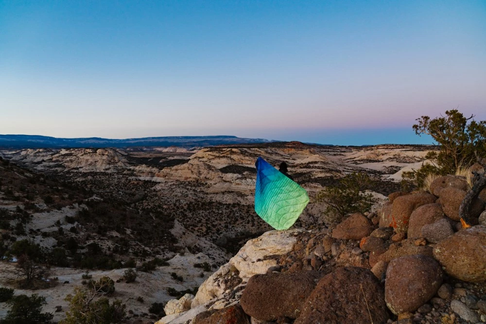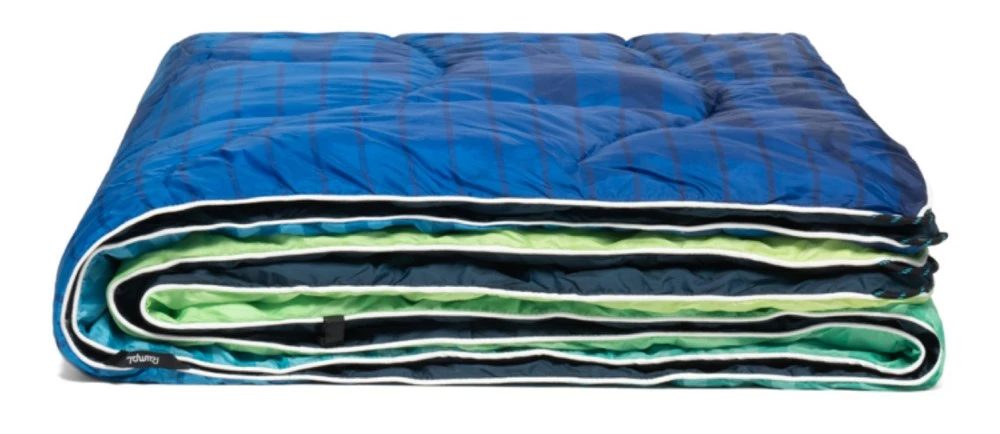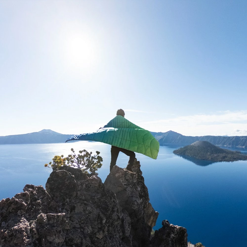 Stay cozy at the campsite or back at home wrapped in the warmth of the Rumpl NanoLoft Puffy Patch Fade Cool blanket you can wear as a cape, with even lighter, warmer insulation than the original.