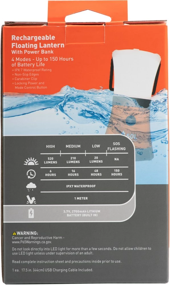 - IPX7 waterproof rating means the lantern can withstand submersion in water up to 1 m deep for up to 30 min.