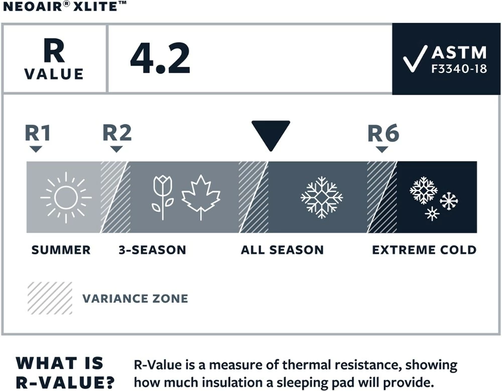 - This pad has an R-value of 4.2, which makes it best for adventures in cold weather; it provides considerable insulation from ground temperature