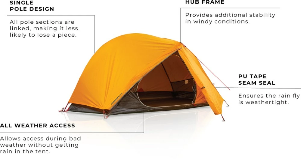 - All-weather vestibule access provides gear storage or covered space to remove wet gear or brush off dirt prior to entering tent