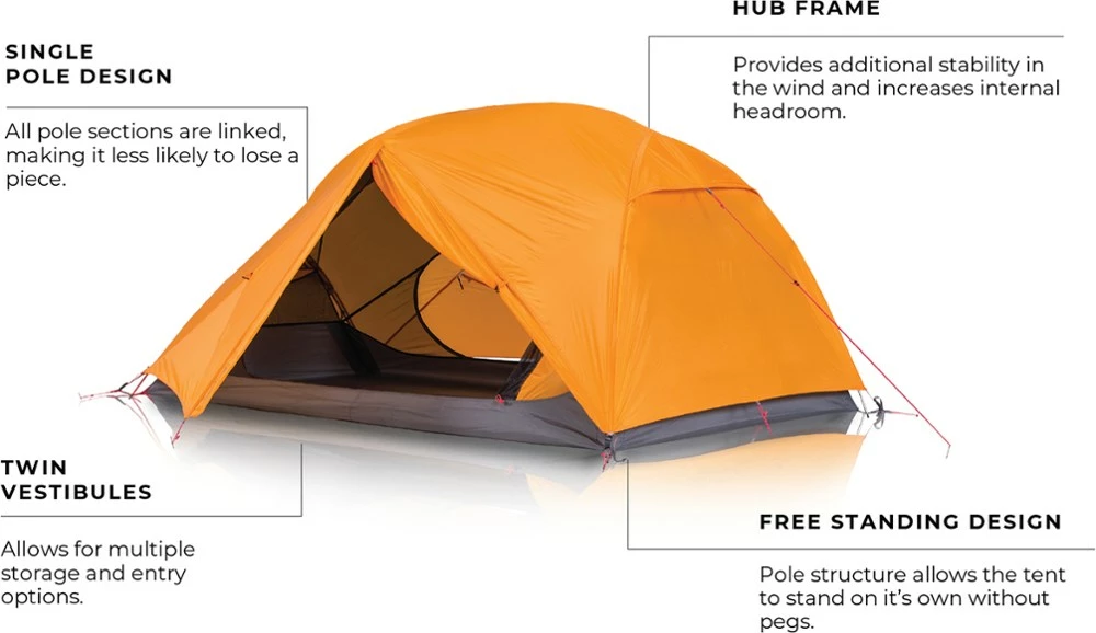 - Pole structure enables the tent to stand on its own without stakes, which is useful for hard ground, platforms or for moving your tent to a new site without taking it down